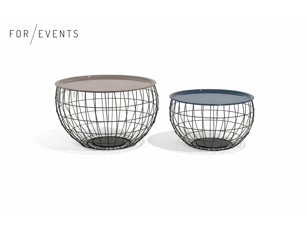 Stylové kovové stolky s drátěnou konstrukcí a odnímatelnou deskou, které zaujmou svým lehkým industriálním designem. Skvěle se hodí jako odkládací nebo konferenční stolky do lounge zón na eventech.